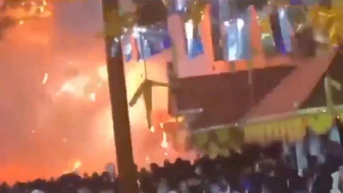 The incident occurred during a fireworks show for the Moolamkuzhi Chamundi Theyyam celebration in Nileshwar, Kasaragod district, when a misfired cracker hit a building containing explosives.